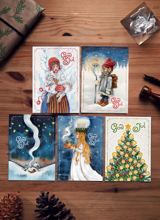 - ENGLISH EDITION - A set of 5 greeting cards with Scandinavian Yule motifs. Packed in a sleeve made from handmade grass-paper.
